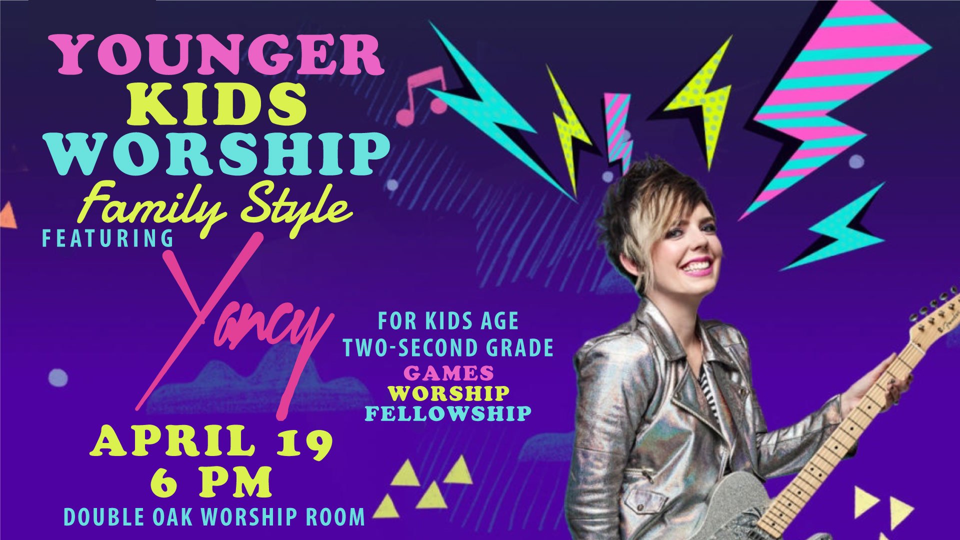 SAVE THE DATE FOR APRIL 19TH! Preschool Ministry is excited to announce a special YOUNGER KIDS WORSHIP-FAMILY STYLE with popular worship leader, YANCY! This will be a fun night for kids age two through second grade and their families. CLICK HERE FOR MORE DETAILS!
