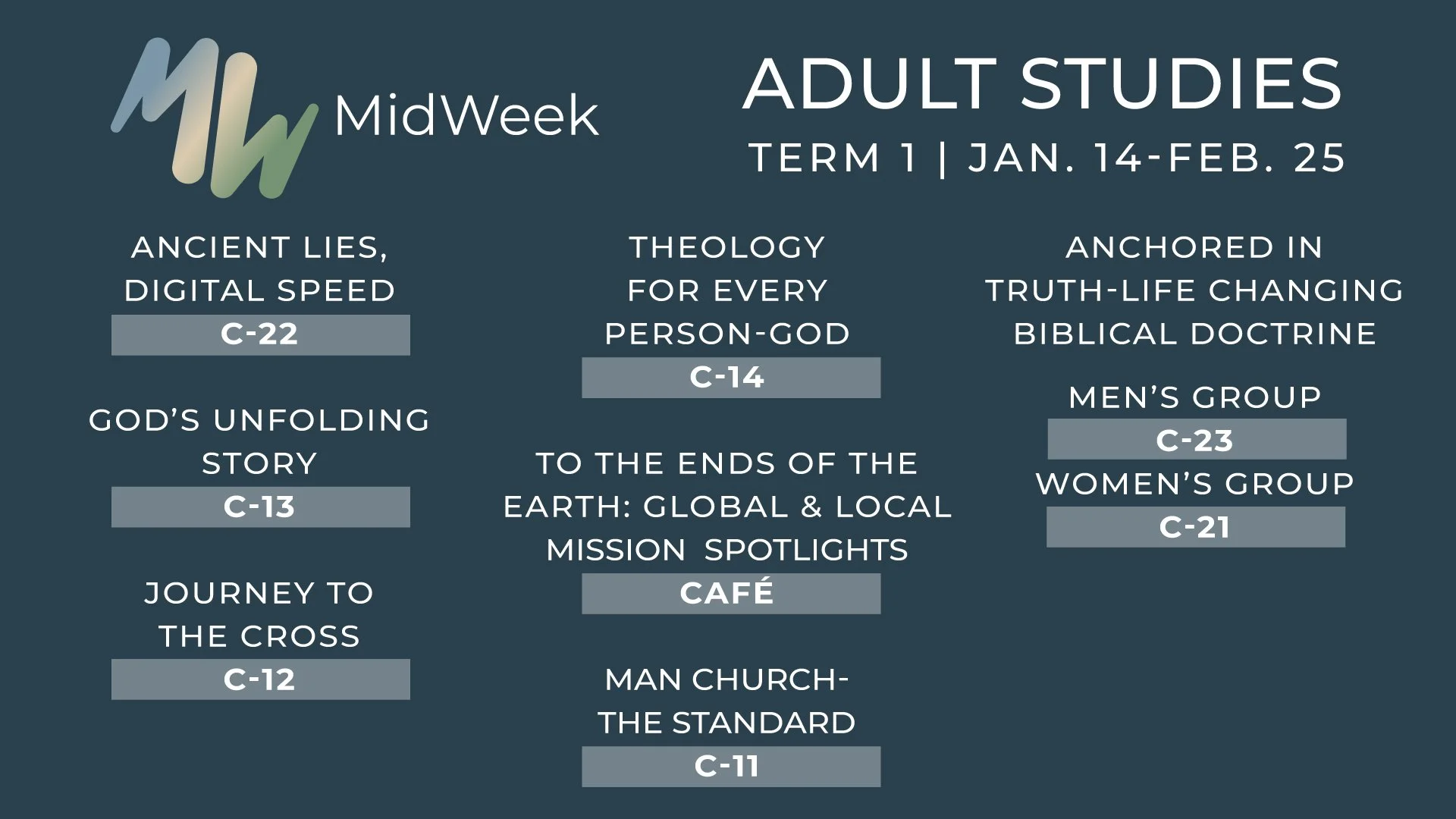 MidWeek Term one launches this Wednesday! We would love for you to join us for one of our classes (listed above). In addition we also have Divorce Care in the Annex as well as several Community Groups Available. Plus, remember we have MidWeek for all ages—Preschool, Kids, Middle School Ministry and High School Ministry. CLICK HERE FOR DETAILS ABOUT ALL OF OUR MIDWEEK PROGRAMMING.