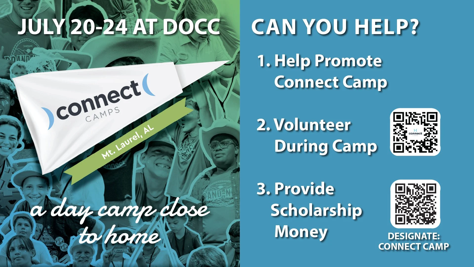 CONNNECT CAMP will be held at DOCC this Summer, and we could use your help! Please consider helping us promote this event (we want this to be an outreach event for our church). You can also volunteer to serve during this camp. CLICK HERE TO REGISTER AS A VOLUNTEER. We would also like to provide scholarships to this camp for kids around us that can not afford to attend Summer Camp. You can give to our scholarship fund by CLICKING HERE TO DONATE ON OUR GIVE PAGE & DESIGNATE CONNECT CAMP SCHOLARSHIP FUND on the drop down menu.